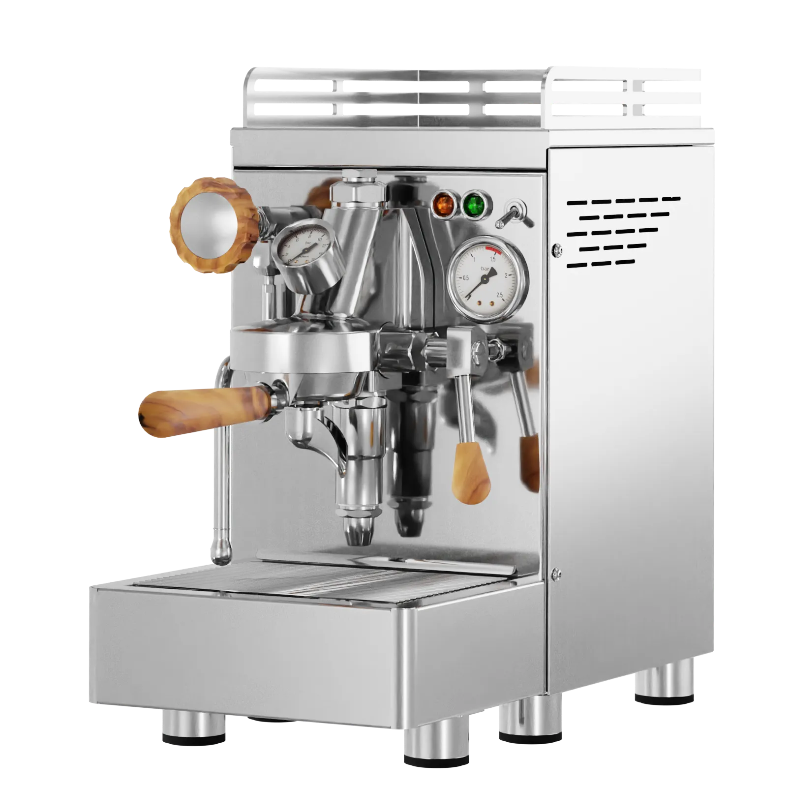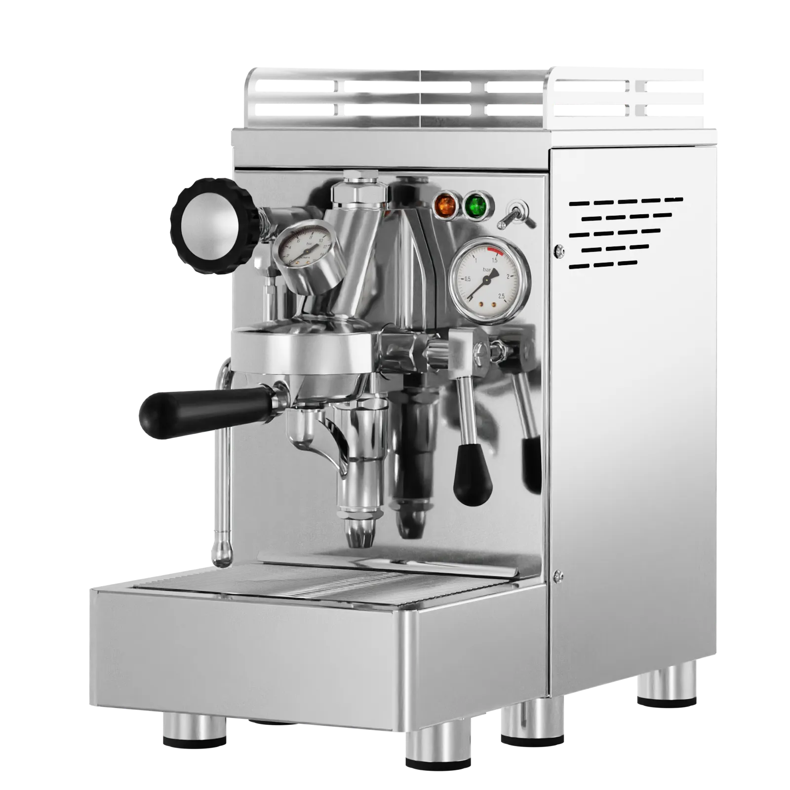 Ein hochweriger Zweikreiser in sehr kompakter Bauform. Bei dieser Siebträger Maschine kommt die beliebte E61 Brühgruppe zum Einsatz. Gerade diese sehr weit verbreitete klassische Brühgruppe ist eine optimale Grundlage um hier hochwertigen Espresso zubereiten zu können.